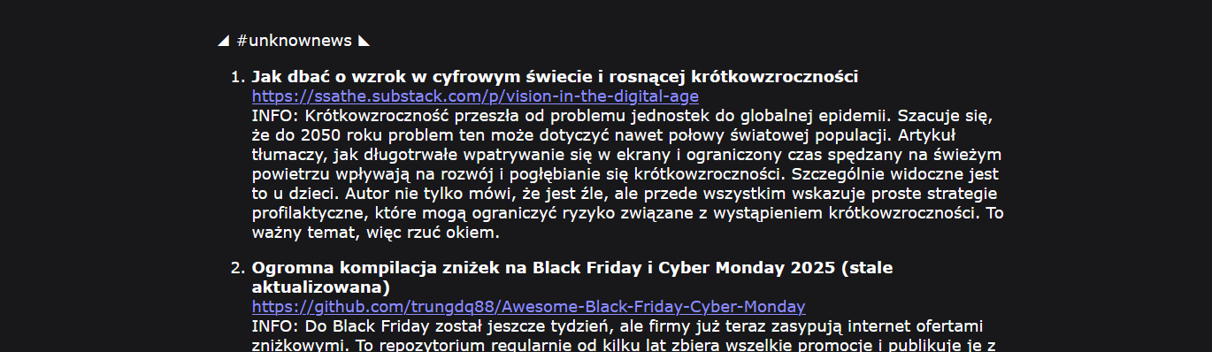 Każde wydanie to lista kilkudziesięciu linków do stron i artykułów dotyczących IT i tematów pokrewnych. Ostatnio sporo treści związanych z AI - m.in. dlatego, że autorem jest Jakub Unknow Mrugalski, współtwórca znanego szkolenia AI Devs.